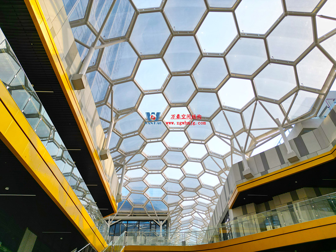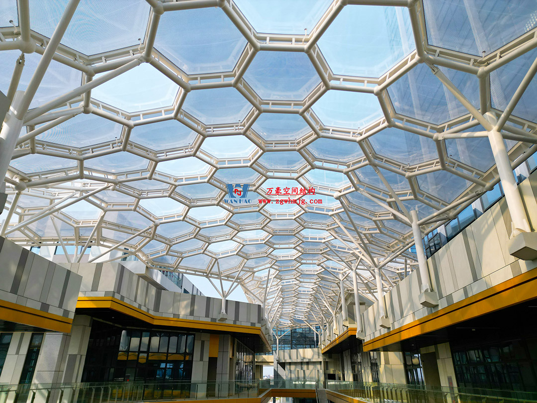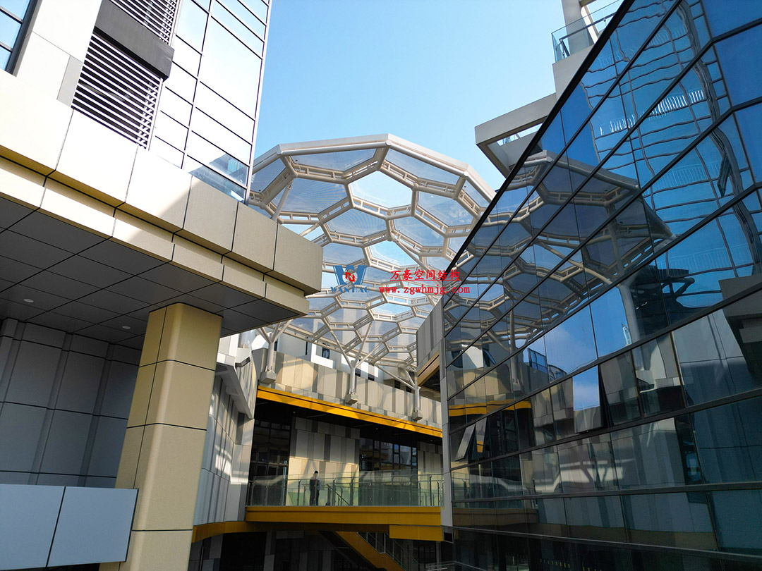 嘉興長安里ETFE氣枕鋼膜結構頂棚工程位于嘉興市長安里街區,該項目總用鋼量約440噸,ETFE膜結構展開面積約3200平米。
