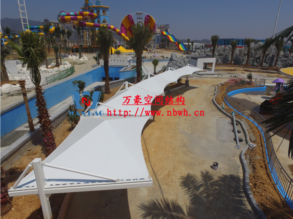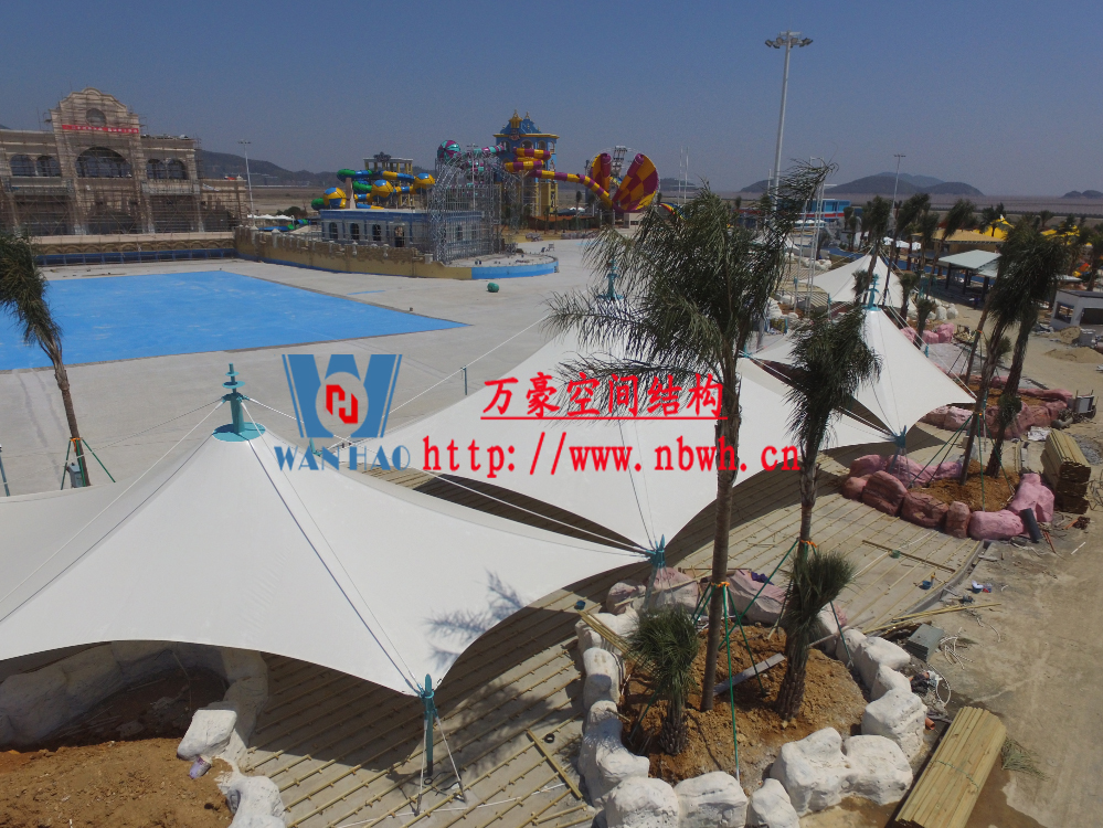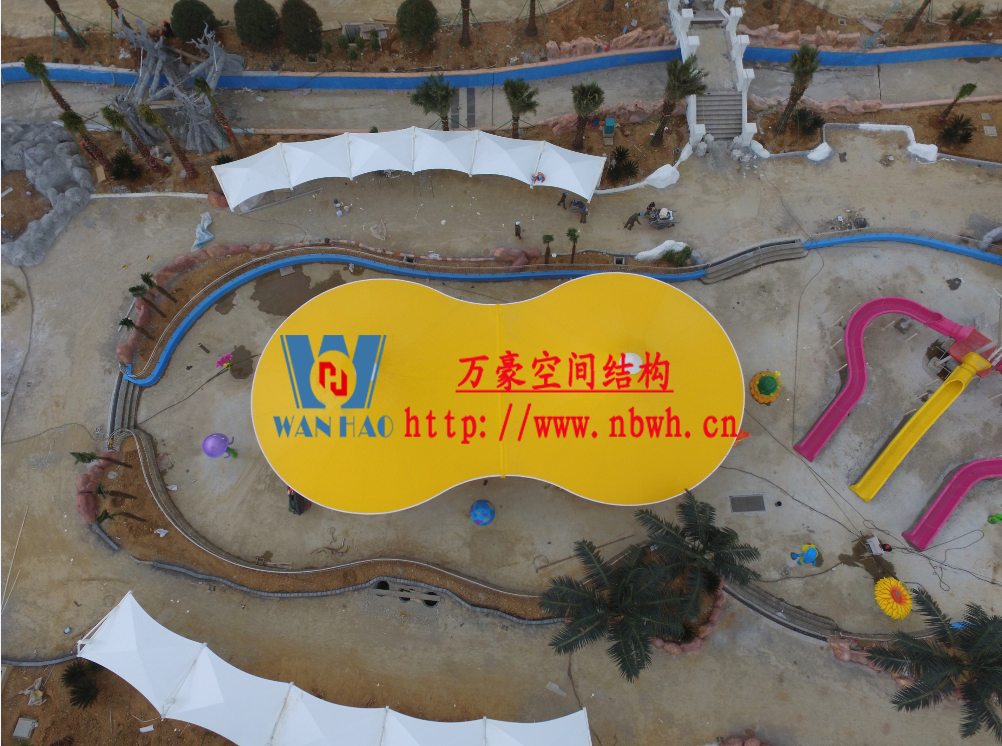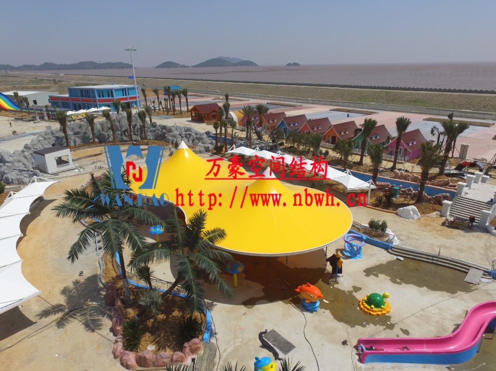 海闊天涳水世界位于浙江省象山縣大目灣新城,北與松蘭山國家“AAAA”級風景旅游區相接,東臨大目洋,南連東陳鄉,距象山縣城8公里,成為大目灣新城最先動建的重大膜結構功能性項目,由寧波萬豪空間結構工程有限公司承建。現場測量、深化設計、制作及安裝由寧波萬豪空間結構工程有限公司全權負責;用鋼量高達180噸,建筑面積達5000平米。