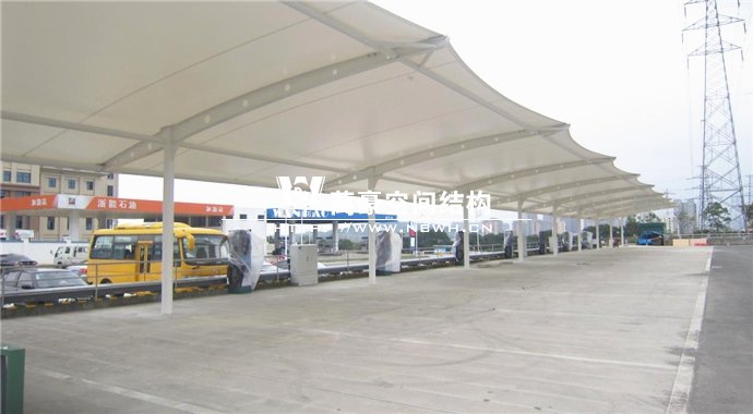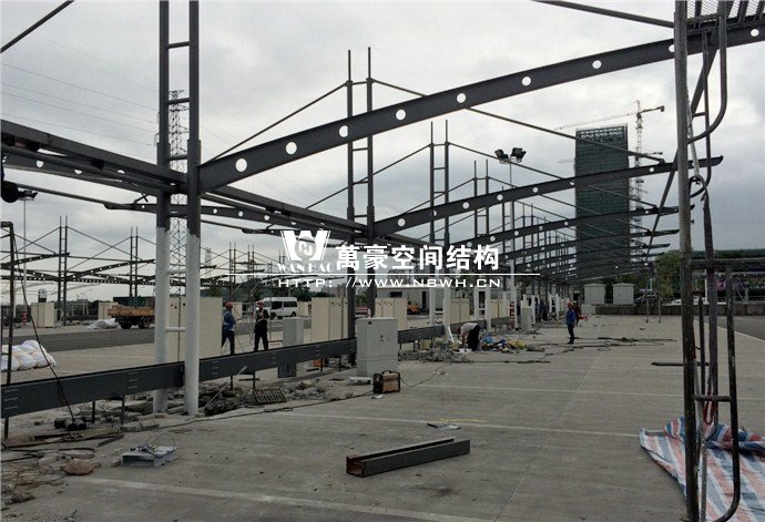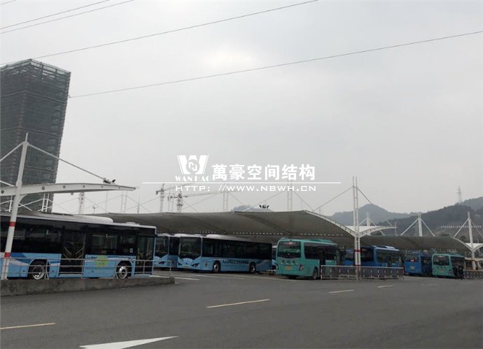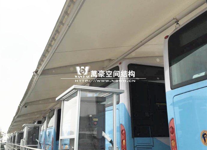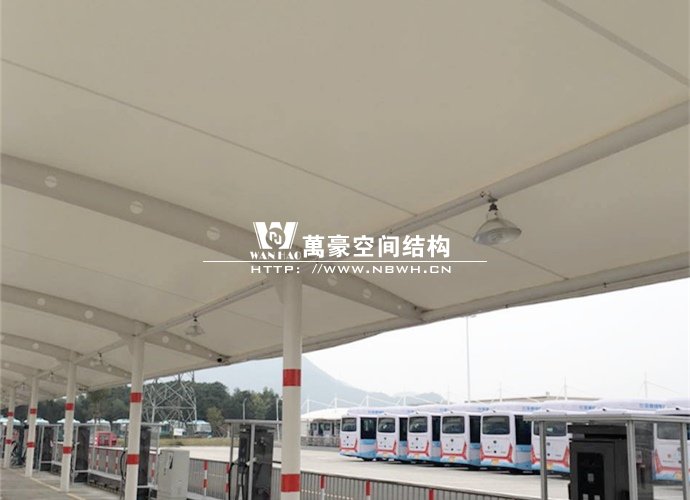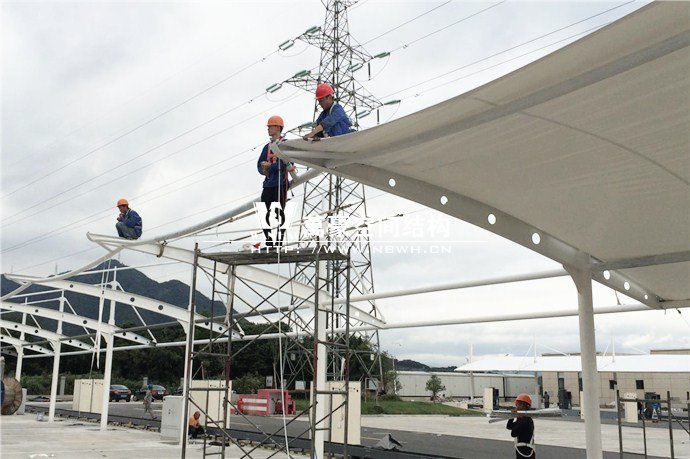 奉化公交西站膜結構雨棚施工面積約5138平方;用鋼量約80噸。施工難點在于工期緊。施工時天氣情況差,連續(xù)的陰雨天給鋼構的油漆施工帶來了極大的麻煩并且延誤了工期。雨棚底下還要安裝充電樁,我們還要和充電樁施工班組進行技術對接,規(guī)劃充電樁的安裝位置。由于工期緊,天氣狀況差,我們動用了兩個施工班組加班加點,土建、鋼構交叉施工,最后如期完工。由于每個雨棚長度比較長,施工班組在立好鋼構件之后從中間開始往兩邊安裝膜布,使工作效率有了很大的提高。