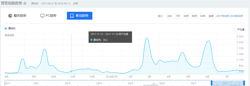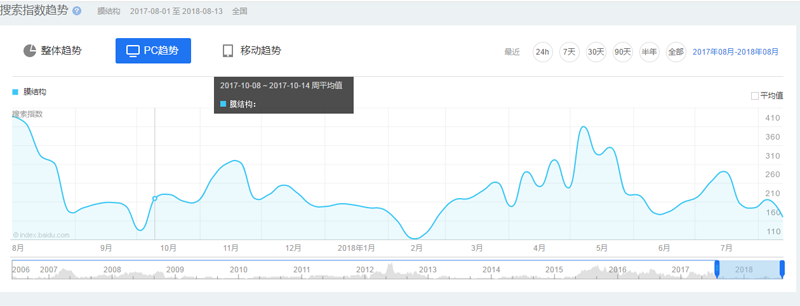 最后,就是中國膜結(jié)構(gòu)網(wǎng)的熱度趨勢了。近些年來,膜結(jié)構(gòu)行業(yè)在中國穩(wěn)步提升,每年的旺季分別在3到6月份,以及8到10月份,所以想做膜結(jié)構(gòu)的伙伴們可以選擇這個時段去做哦。