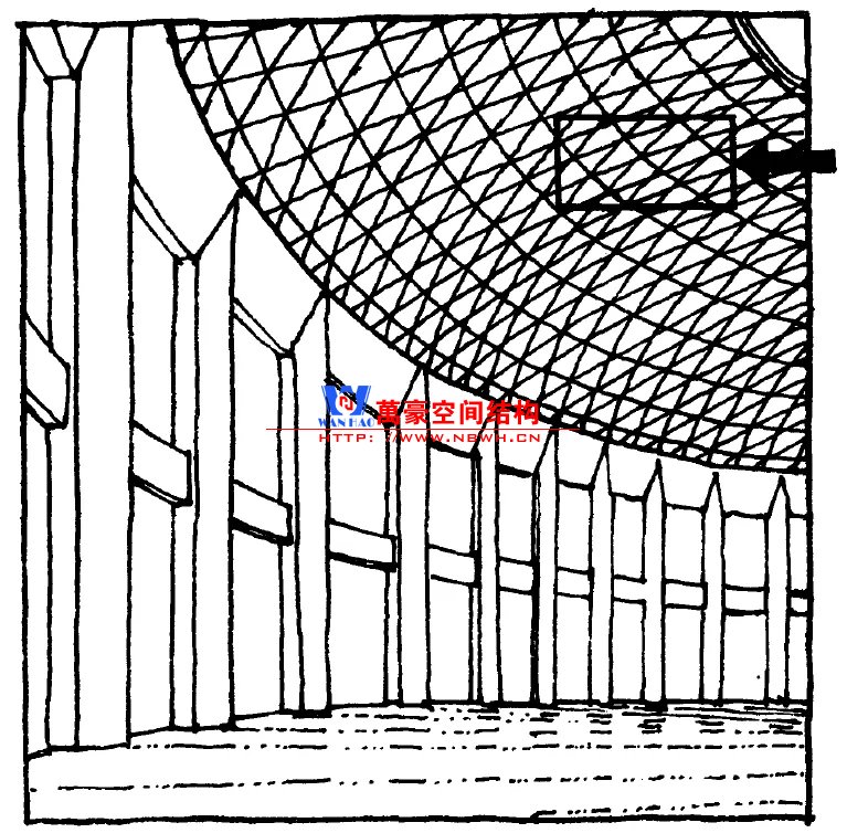 提高平面內(nèi)剛度的直接方式是采用三角形網(wǎng)格。富勒發(fā)明了短線呈穹頂,并應(yīng)用于1967年蒙特利爾國(guó)際博覽會(huì)上的美國(guó)館——一座直徑為76m的3/4球形建筑。