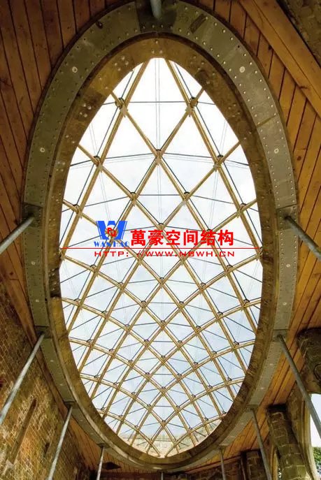 這是一個(gè)古老的鑄鐵網(wǎng)殼,建于19世紀(jì)后期。可以看出,這個(gè)網(wǎng)殼沒(méi)有斜桿,它是利用桿件的抗彎能力來(lái)抵抗平面的扭轉(zhuǎn)。