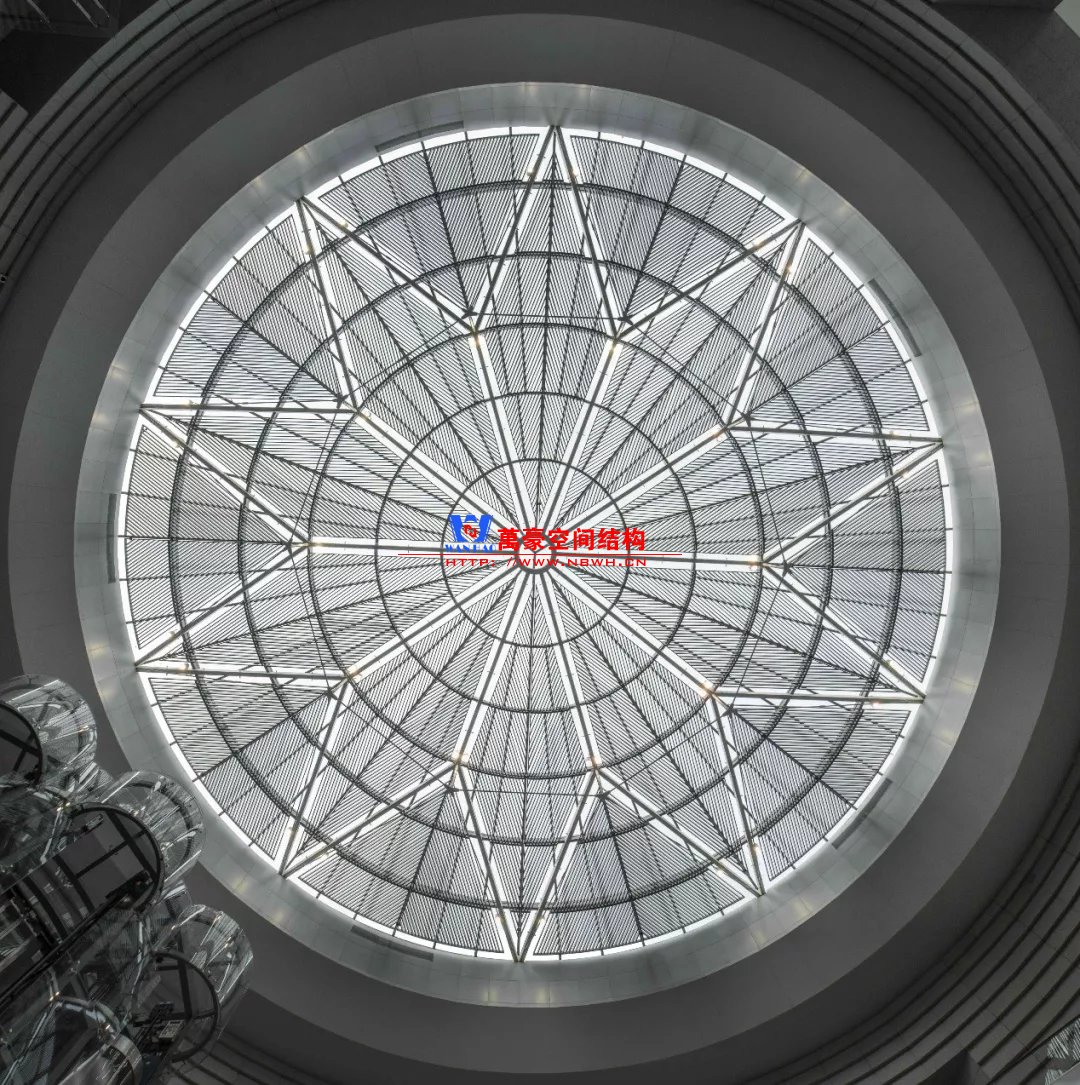鋁合金結構網殼經典案例也有很多,其中近兩年被大家熟知的有牛首山大小穹頂和北京新機場天窗。鋁構件的尺度都很小,從通透性上來說,效果比普通鋼網殼要好。對于本項目要填滿的圓圈,也不失為一種選擇。