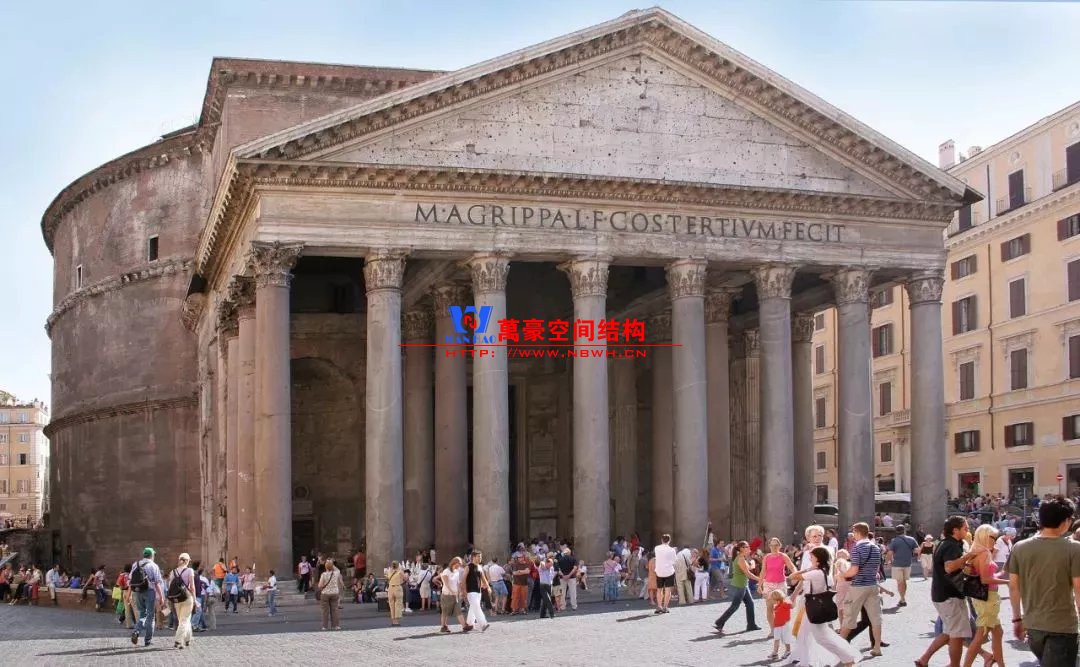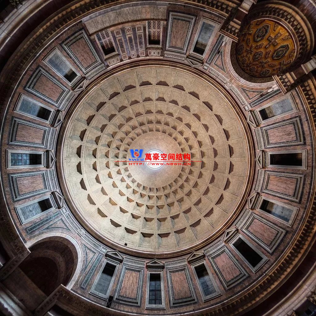 萬神殿穹頂直徑43.3米,最高點也是43.3米,中部采光洞口直徑8.9米。穹頂采用古老的混凝土,其材料特性與石塊類似,抗壓王者抗拉弱雞。而穹頂結構以受壓為主,建筑材料與結構體系可謂天作之合。