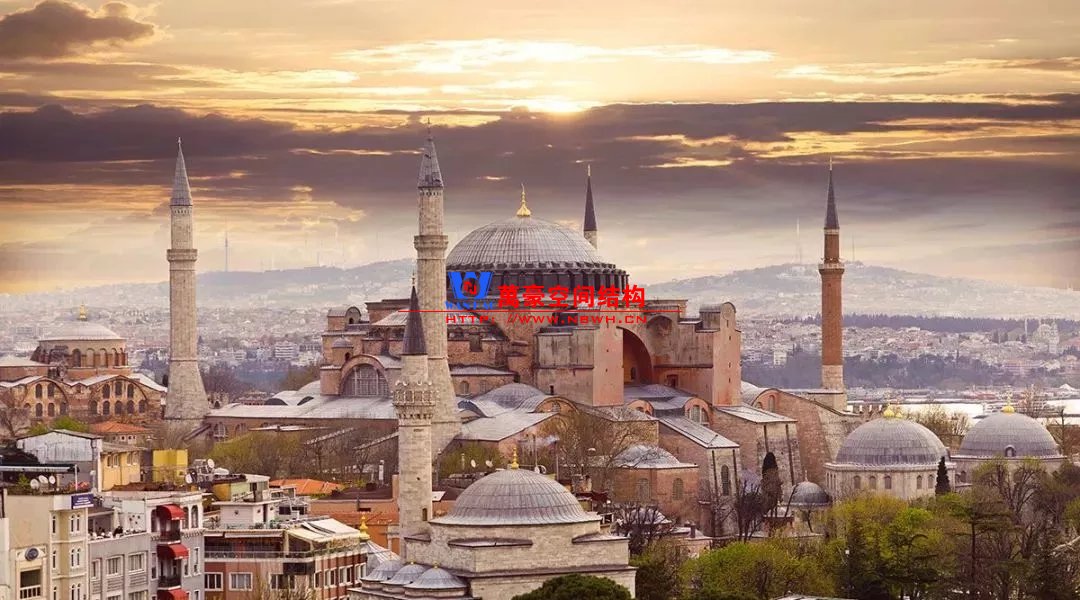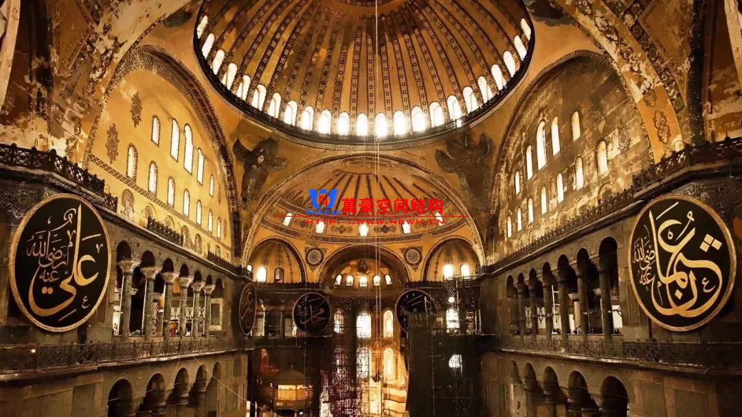 一千五百年前的圣索菲亞大教堂也因其巨大的穹頂而聞名于世。穹頂直徑31.24米。這座著名的穹頂也算是命運多舛,自建成之后由于穹頂自身巨大的側推力曾先后倒塌三次。工程師也曾試圖通過增加墻厚、增設飛扶壁、增加穹頂矢高等方法加固,但依然沒有結束它不斷倒塌的命運。