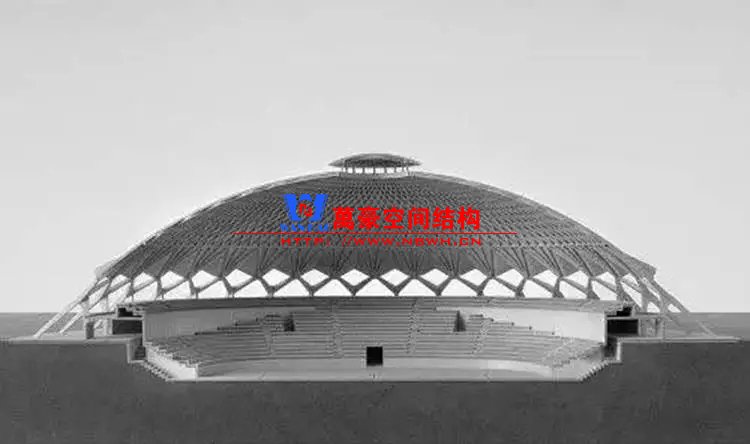 羅馬小體育館(Palazzetto DelloSport)不僅由奈爾維設計,而且由其建筑公司(Nervi and Bartoli Engineers公司)建造。組成薄殼穹頂的1620塊用鋼絲網水泥預制的菱形槽板,在地面模板上澆注成形。板間的鋼筋混凝土肋和節點現澆,之后在上面再整澆一層混凝土,形成整體并兼作防水層。由于采用了奈爾維體系(Nervi system)”工法,建造成本大幅降低,而工期僅用了7個月時間。預制的菱形板和現澆的肋線,形成優美的天花,堪稱建筑、結構、施工完美呈現的藝術品。