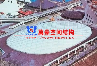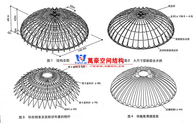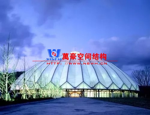 出云穹頂,球形穹頂直徑143.8米,拱頂部高度48.9m米。它最大的結構特點是綜合性。材料上有鋼、木、薄膜;結構形式上有拱、桁架、索膜結構,并充分發揮了每個部份的優勢。
