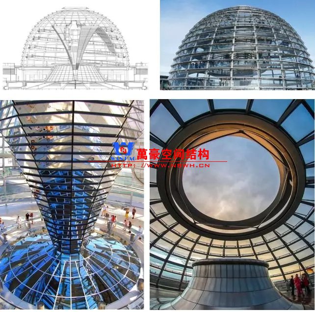 德國國會大廈改造中的穹頂即采用了肋環式網殼,中庭中部還有一螺旋式通道一直引領人們到達圓頂和瞭望平臺。相對于混凝土網殼,鋼與玻璃的組合通透性更好,同時也更符合密斯對于現代建筑的定義和現代人的審美標準。