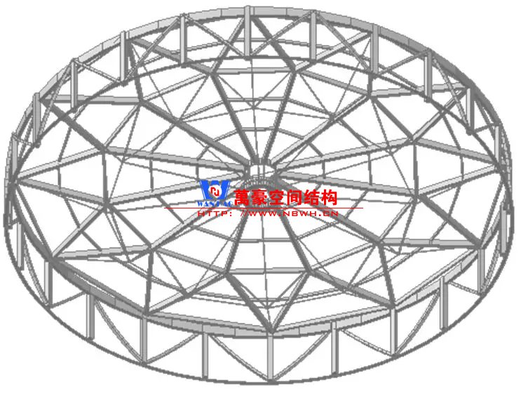 木質拱架是穹頂最主要的受力構件,共有36榀,呈放射狀布置。拱架以受壓為主。穹頂中心為鋼質的承壓環;底部是木質空間桁架形式的拉環,使得穹頂成為自平衡的體系,減小對柱子和基礎的推力。同時采用鋼拉桿以張弦的形式加強球殼面外抗彎剛度。外表覆蓋以白色膜材,在兩個骨架之間(折面波谷處)用穩定索把薄膜向下壓緊,形成V字形狀,可以使積雪自然滑落。