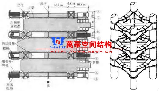 (1) 結構的主要承重構件為兩端的巨型格構柱,承受全樓的重力荷載和水平荷載。每個巨型格構柱的平面輪廓尺寸為4.8mx5.1m,由4個圓鋼柱組成,鋼柱間每隔3.9m(層高)均連以矩形截面加腋鋼梁,形成空腹格構式的豎向構件。水平面內(nèi),還增加了斜向的交叉撐。