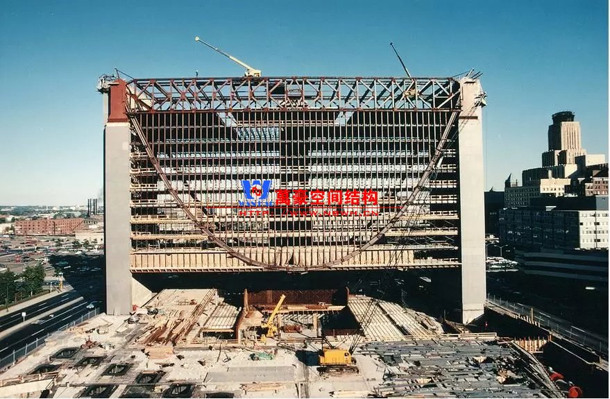 懸索上部支承著受壓鋼立柱(工字形截面),其下部以同樣的間距吊掛著受拉吊柱(扁鋼)。為方便連接,數(shù)根4英寸(100mm)直徑的懸索內(nèi)嵌在寬翼緣的構件中,立柱和吊柱均與懸索外面的構件相連。