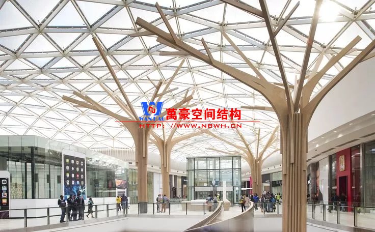 有的天幕雖然設計為曲面,但其曲面形狀的力學性能差,結構受力仍然以抗彎為主。這類曲面天幕結構與樹形柱相結合,才能以較細小的結構構件完成。