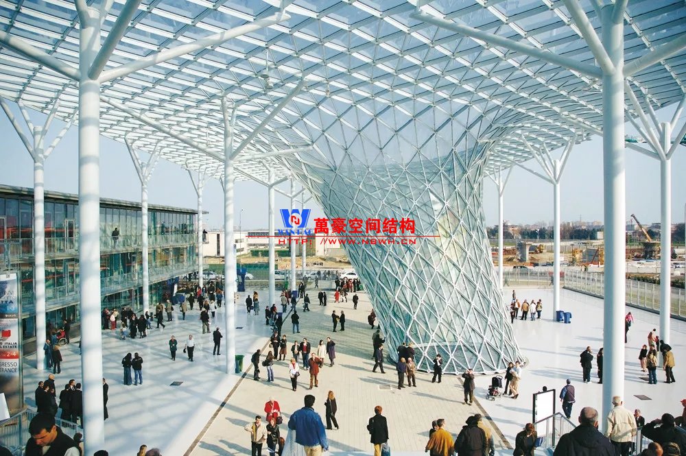 以上各種天幕結構均是支承在周邊建筑或樹形上的。除此以外,還有一種以天幕網格獨立或相對獨立支承的結構,其建筑形態往往呈現“喇叭形”。