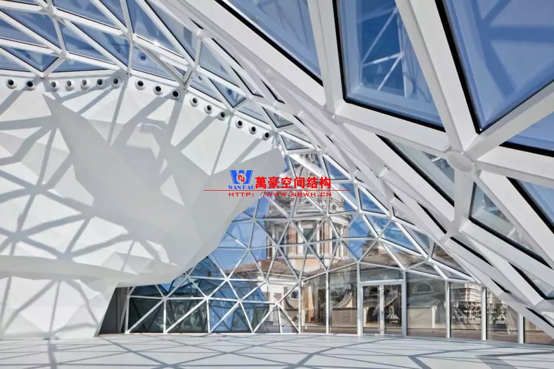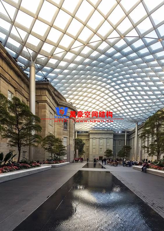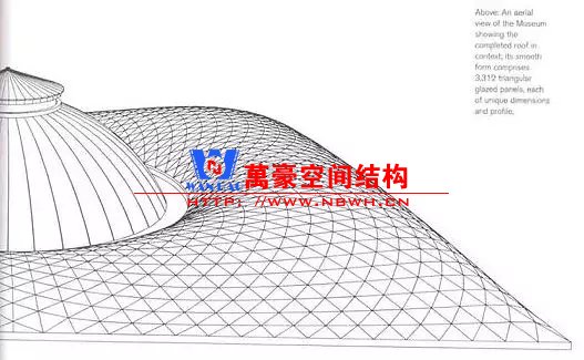 原有博物館建筑為天幕提供了一個堅固的邊界條件,使得網殼可以充分發揮形體的作用。構件以軸力為主、截面纖細,極大地突出了整體通透明亮的建筑效果。