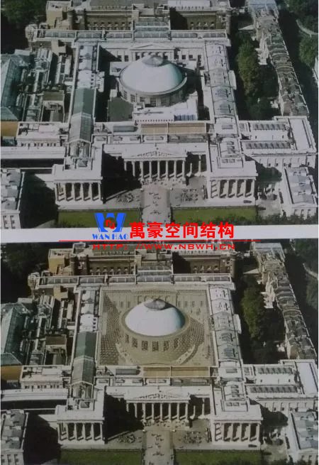 這個經典的改造項目把輕與重巧妙組合。鋼結構網殼內側支承于圓形閱覽室,外側支承于方形博物館建筑的內墻,通過找形分析得到一個拱起的規則形態。