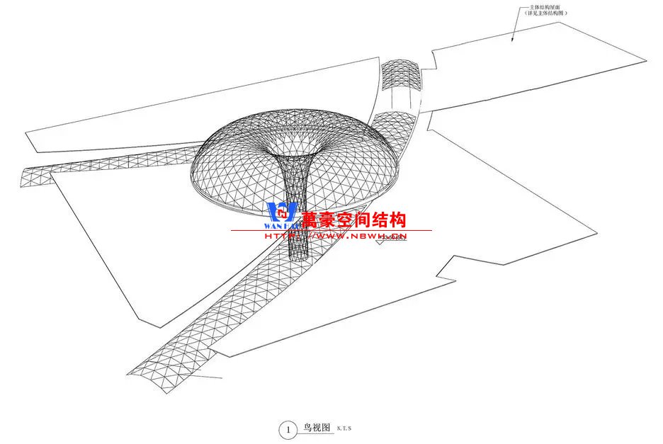 沿中心圓徑向布置主受力網格,再輔助另兩個方向的圓弧線條劃分出1656個三角形平面玻璃板。