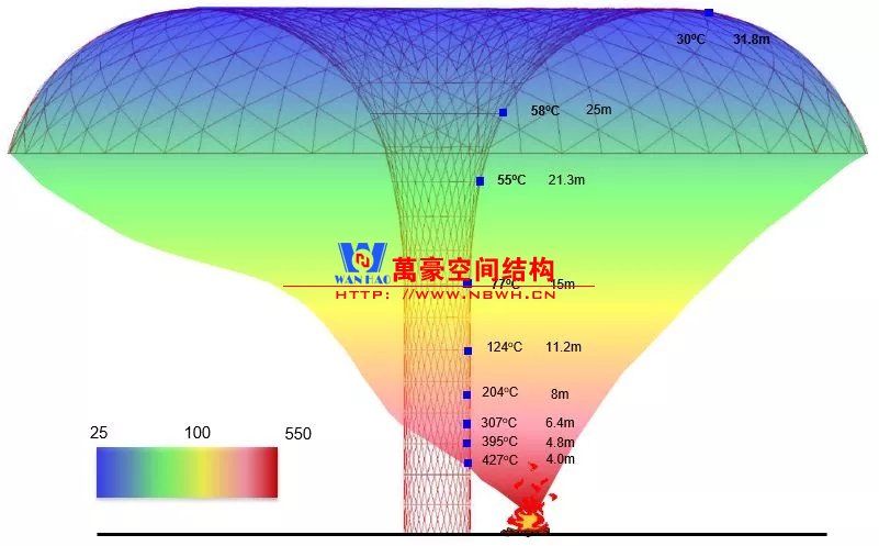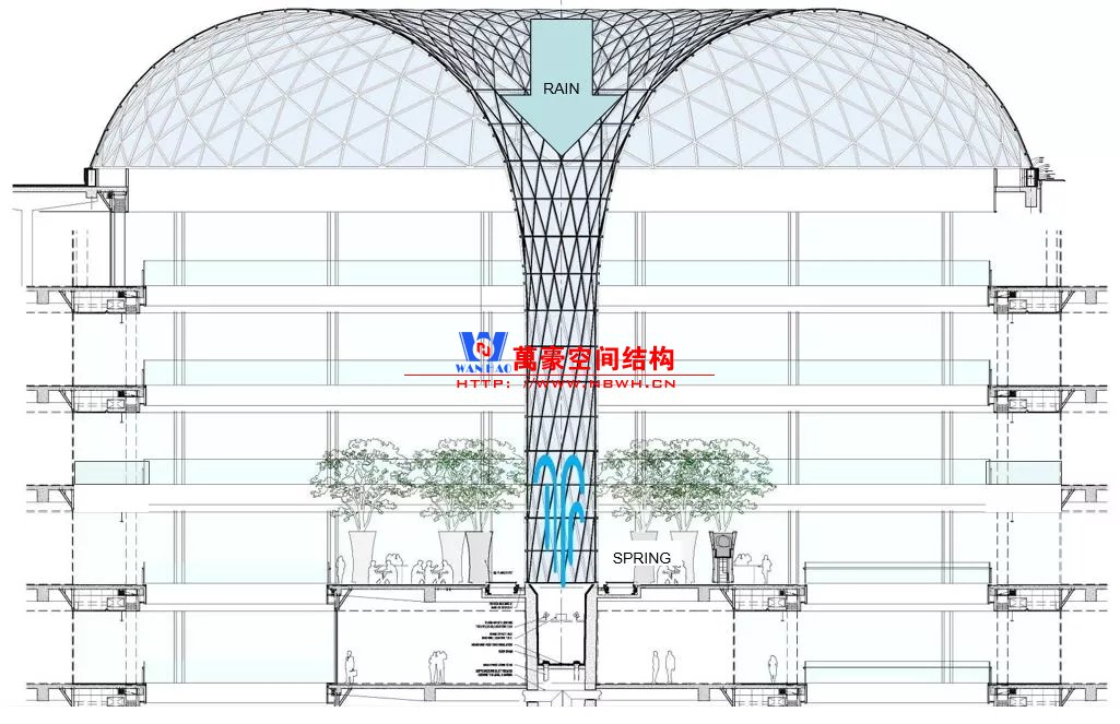 根據消防規范,中庭鋼結構要涂防火涂層以提供1.5~3小時的耐火保護。通過性能化分析,設計師提出創新的水簾保護系統作為鋼材防火替代方案。水簾經由氣化,可以吸收火與煙霧大部分熱量,使鋼材表面溫度顯著降低。