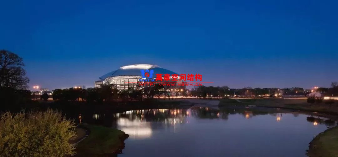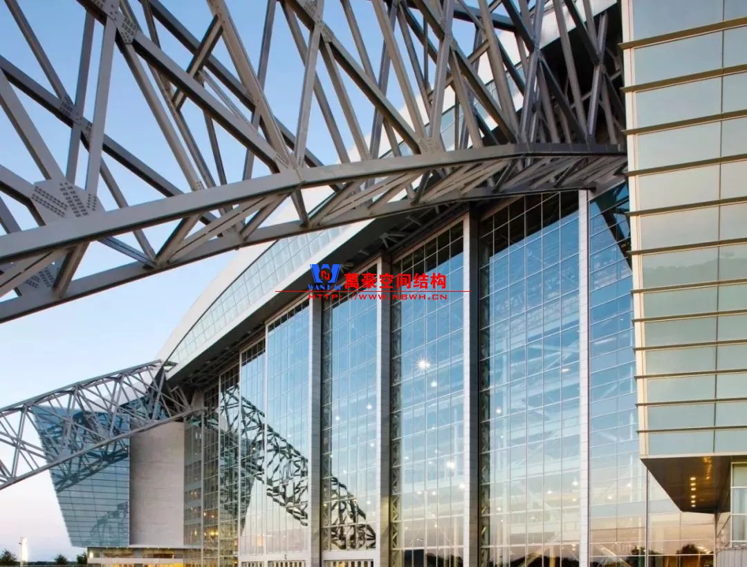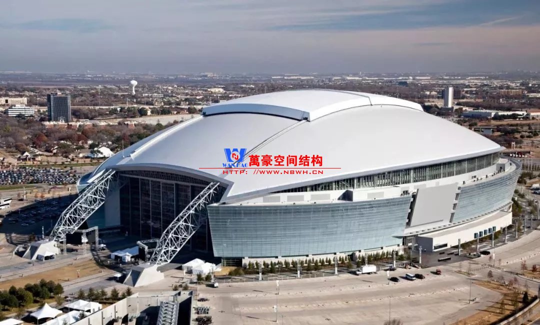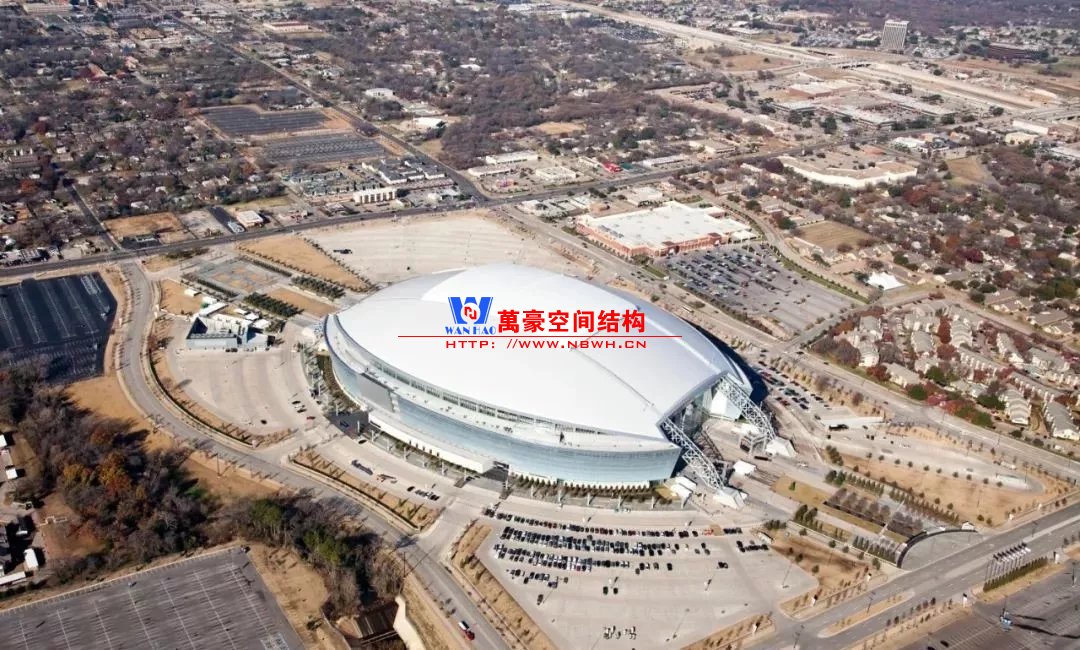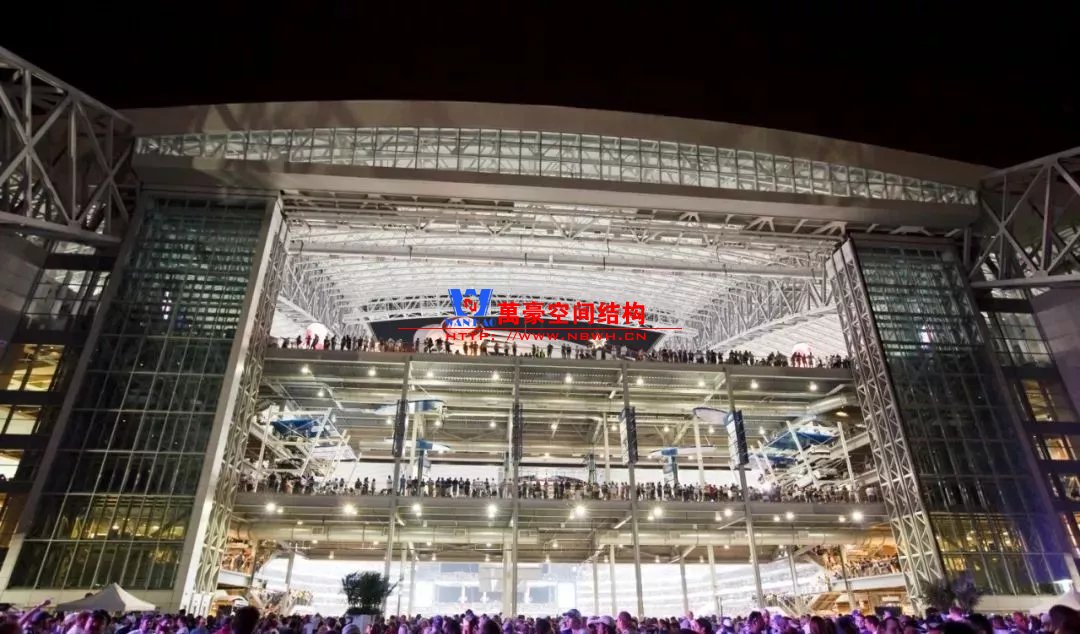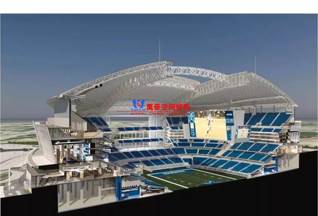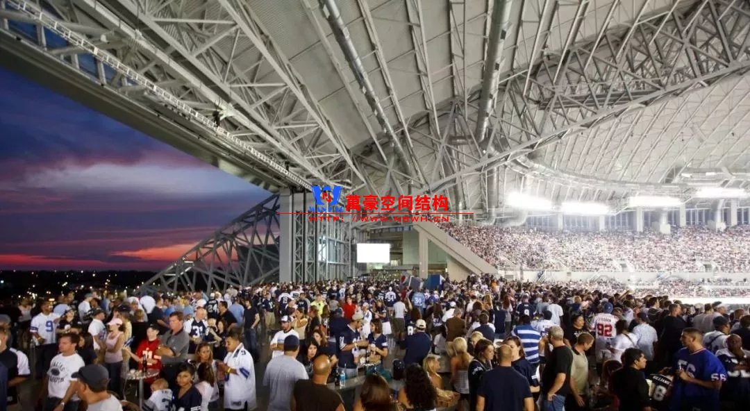 兩個(gè)鋼制拱形結(jié)構(gòu)分別覆蓋整個(gè)體育場(chǎng),長(zhǎng)達(dá)1,290英尺,支撐著體育場(chǎng)龐大的內(nèi)部空間,構(gòu)建了球場(chǎng)兩端入口的球迷廣場(chǎng)。