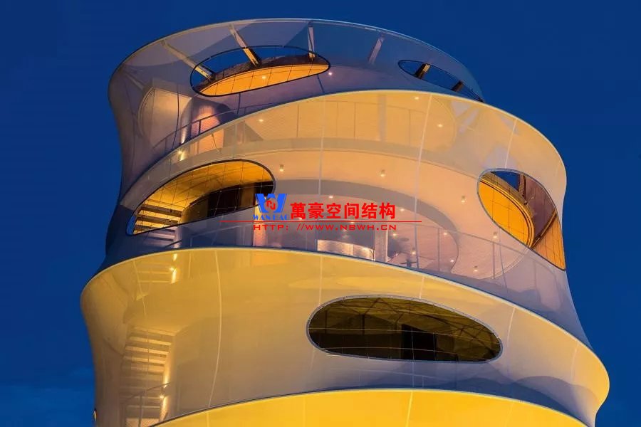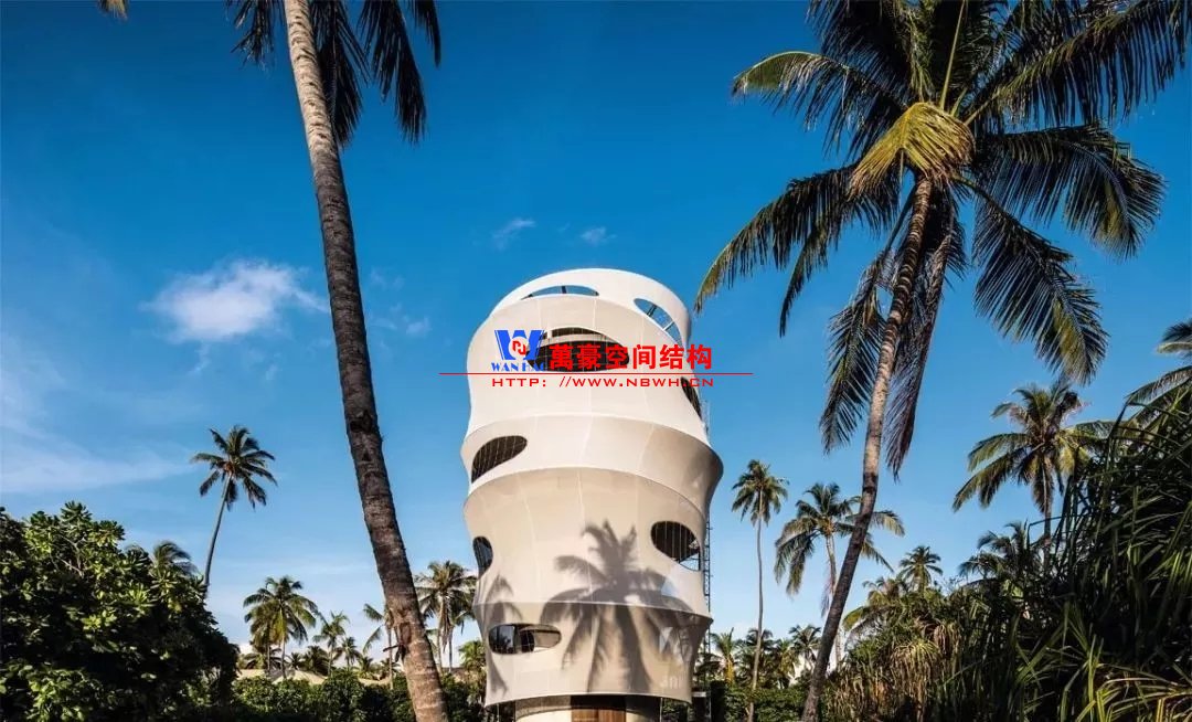 與島上其他傳統(tǒng)的“塔瓦魯”風格建筑不同,由于其高度為23米,并且采用特殊結(jié)構(gòu),目前的結(jié)構(gòu)在島上占主導(dǎo)地位。建筑物的正面使用了鋼筋混凝土整體結(jié)構(gòu),而不是傳統(tǒng)的天然材料。它用作支撐管,由各個預(yù)制臺階制成的控制臺樓梯圍繞該支撐管旋轉(zhuǎn)。外圍的所有元素都被遮蓋在淺灰色半透明的法拉利381網(wǎng)孔膜中,遮陽隔熱,又不影響視覺通透性。