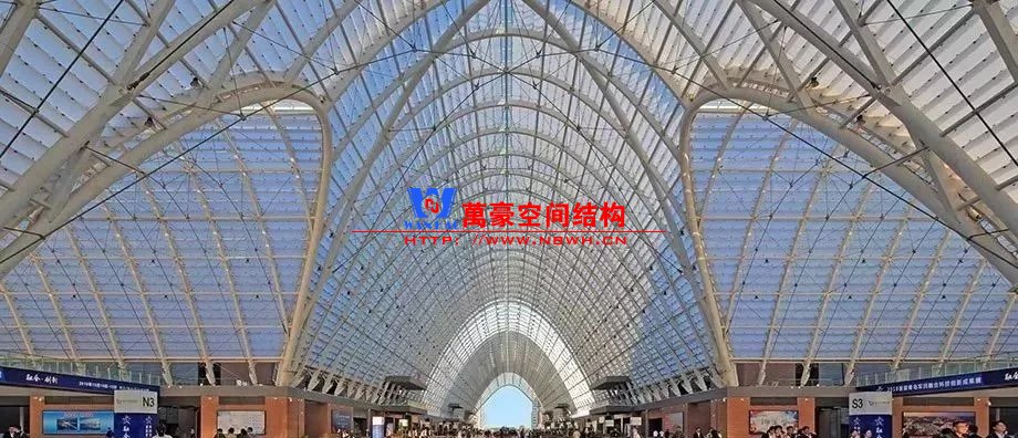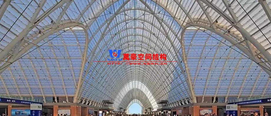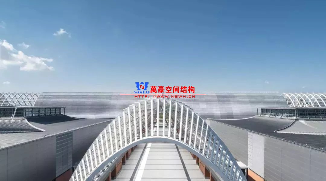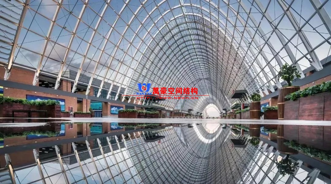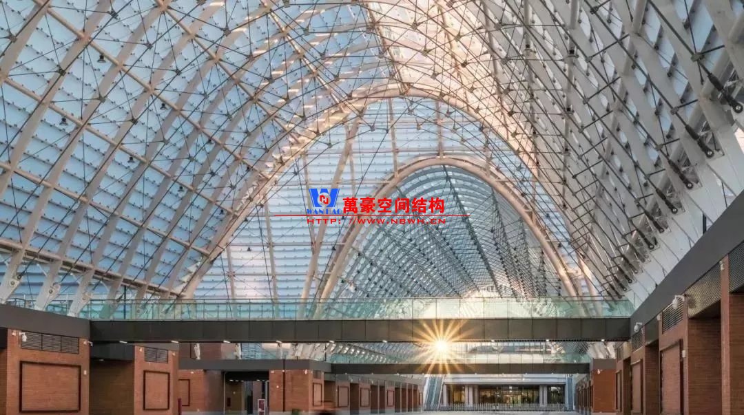 建筑內在的空間結構形成了外部形態的美學韻律和視覺沖擊力,使建筑形象真實而動人。包括展廊與展廳兩部分,以中央十字展廊為功能組織核心,南北各布置6個、共12個獨立展廳單元(尺寸74.4m×136.4m,采用變標高的空間桁架鋼結構)。展廊平面呈十字型布置,東西向長507m,南北向長287m,主拱和次拱方向分別設置兩道溫度縫,最高點標高為35.0m。