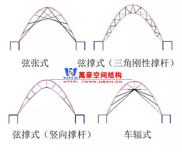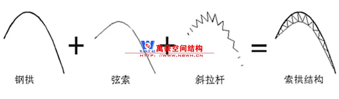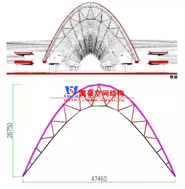下部主體結構為混凝土框架體系,地上一層,局部設置一層地下室。十字展廊屋蓋結構為預應力索拱結構,索拱平面外順柱面網殼沿縱向利用高強鋼拉桿通長設置交叉支撐,以保障索拱面外的穩定。
