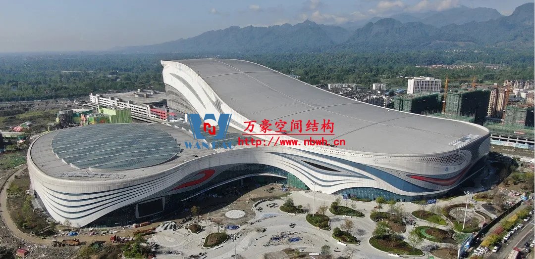 成都融創文旅城水雪綜合體項目是成都融創文旅城的核心主體建筑,主要由雪世界、水世界和停車樓組成,總建筑面積36.76萬平方米,水雪綜合體項目用鋼量約2.4萬噸。其中,雪世界最大長度達428米,跨度由174米漸變至94米,地下2層、地上5層,整體結構立面高度最低35米,最高85米,是全國最大鋼筋混凝土結構室內滑雪場。