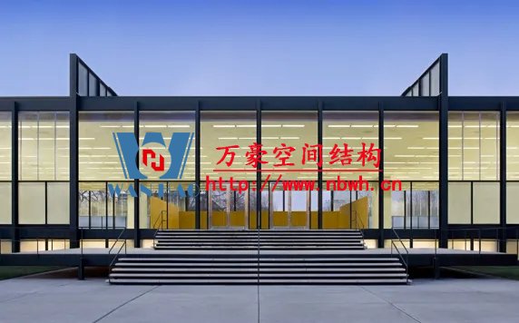 伊利諾伊工學院的克朗廳(1950-1956)是密斯通用空間設計哲學的最佳例證。克朗廳是一個單純的220x120英尺(大約66x33米),高24英尺(約7.2米)的長方形,懸掛屋頂的4根鋼梁焊接在8個鋼柱上,都位于室外,以創造全無遮擋的內部通用空間;柱間的大片玻璃采用不同的透明度,在開放的平面外包裹著輕盈精巧的鋼和玻璃的立面。室內采用獨立的橡木隔斷來區分班級、授課和展覽的空間。盡管克朗廳在滿足繪圖室的使用功能時面臨采光、隔熱和噪聲等諸多使用上的不足,密斯仍然堅定地稱之為“最為清晰的結構”和“最佳表述的哲學”,他對通用性如此解釋:“在我看來,靈活性與需求有關……沙利文說過:形式追隨功能——我認為在我們的時代這一點已經極大地改變了。如今,功能是非常短暫的,而且我們的建設持續時間更長。因此,只有使設計非常靈活才是有意義的。”基于通用空間概念,密斯設計的結構同時實現了功用的靈活性和技術的紀念性,因此成為20世紀最有影響的大空間經典之一。