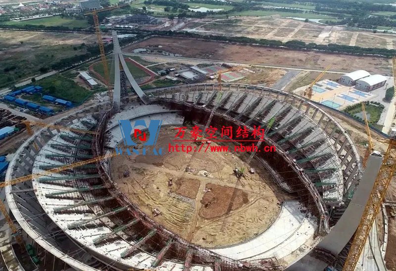 走進援柬埔寨國家體育場,現場張拉施工正在如火如荼的進行,最長達160米的巨型鋼索綿延環繞在體育場四周,猶如盤踞的巨龍。兩個高達99米的人字形吊塔一端拉起18根斜拉索,另一端連接8根背索,與索桁架共計1100鋼索將看臺罩棚高高擎起。從空中望去,猶如在一把天傘被中部鏤空,再被兩把豎琴輕輕吊起,整體結構氣勢恢宏,美輪美奐。目前,體育場罩棚索網張拉施工已圓滿完成。