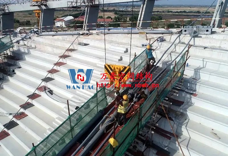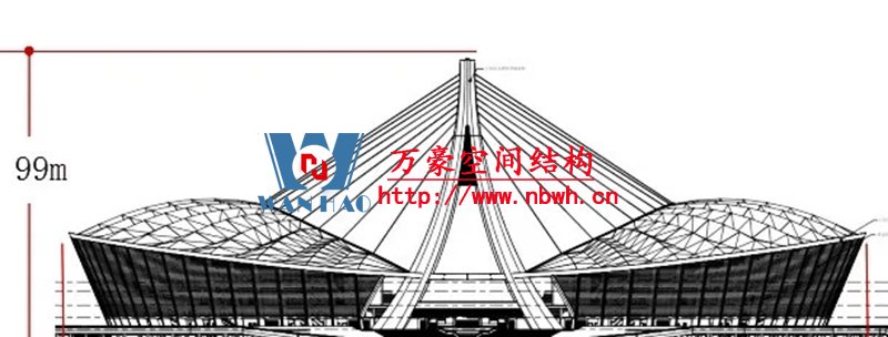 索桁架猶如一把“大傘”自重輕、剛度大,斜拉索與兩座人字形吊塔猶如兩把空中“豎琴”,可實現更大跨度。“大傘+豎琴”的結構組合代表著當今世界空間結構技術發展的最高水平,同時也是項目的最大難點所在。