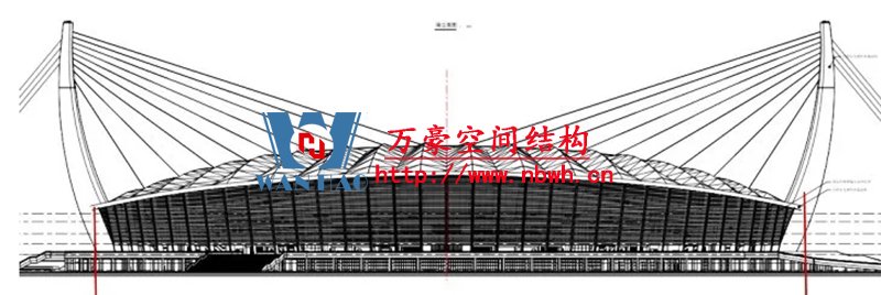 體育場看臺罩棚采用新型索桿張力結構形式 —— 斜拉-索桁張力結構,該結構在較為常見的索桁架結構體系中又引入了斜拉索的作用。