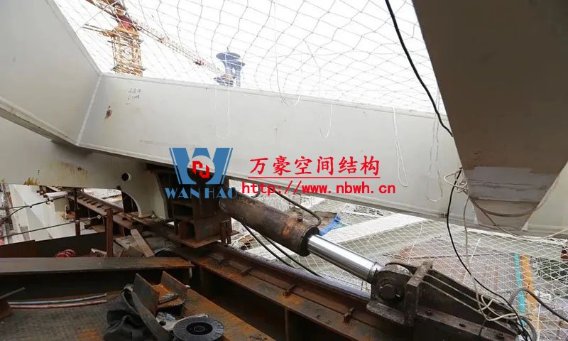 滑移前,事先設(shè)置滑軌,鋼橋兩端各安裝1臺-2臺液壓千斤頂和同步傳感器,從2個平臺分別向兩側(cè)頂推滑移,每滑移6米要進(jìn)行鋼索張拉,確保屋面結(jié)構(gòu)穩(wěn)固,最終將屋蓋滑移到設(shè)計位置。