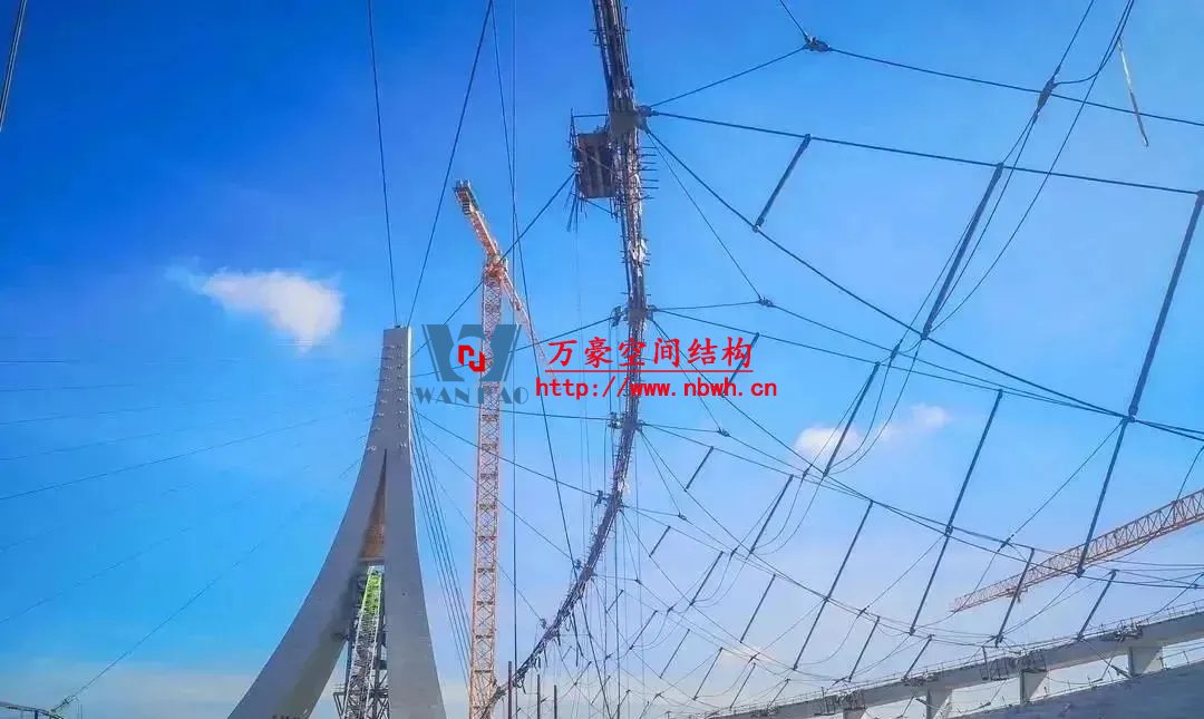 索膜罩棚結構由2.2萬米拉索、219噸索夾節點、3.3萬平米PTFE膜共同構成,如何平衡“天傘”索網結構,提升張拉過程中拉索產生的拉力?如何確保索網張拉成形過程中,索桁架體系穩定?這是建設者實施索網張拉,需要攻克的核心技術難題。