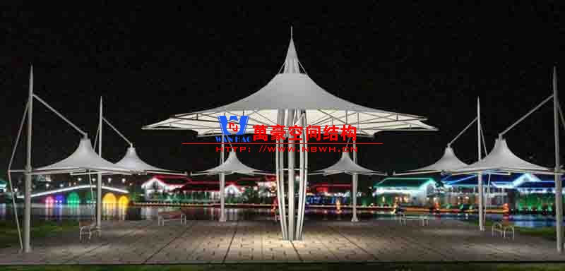 膜結構遮陽棚工程頂棚面重量僅為常規遮陽棚的1/30,這就降低了基礎的造價。同時膜結構工程奇特的造型和夜景效果有明顯的“建筑可識性”和商業效應,其價格效益比更高。