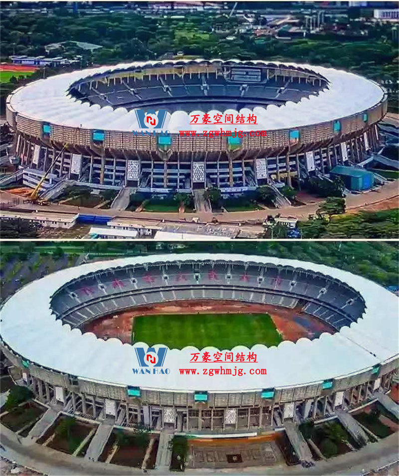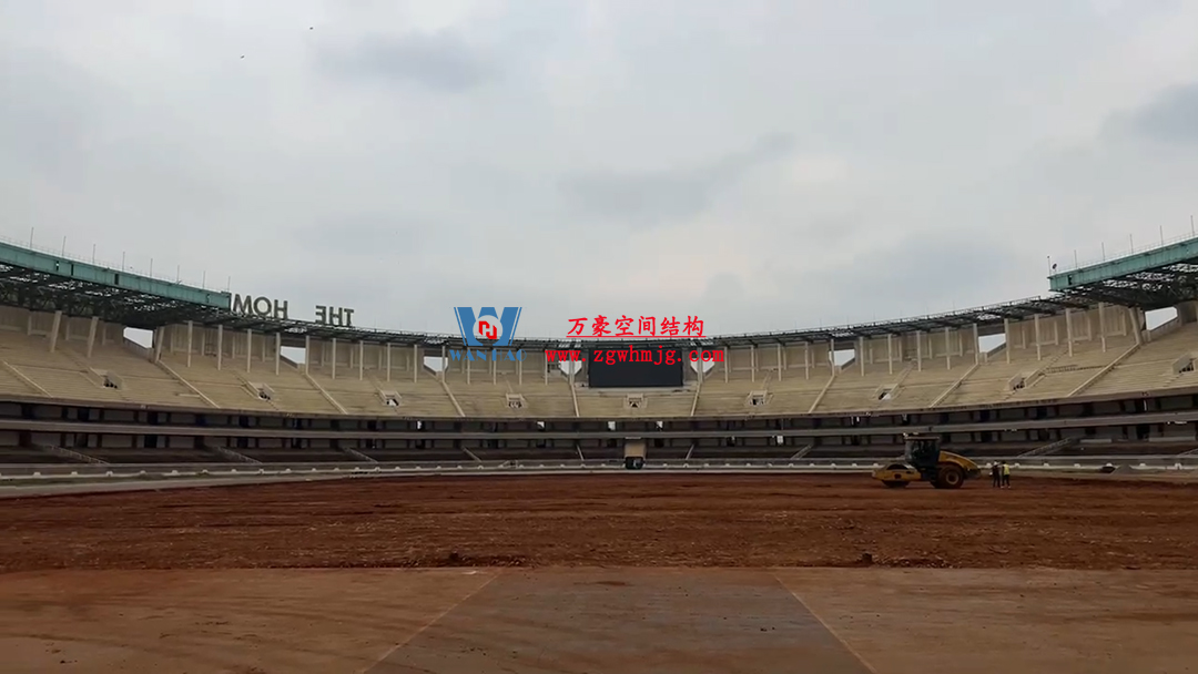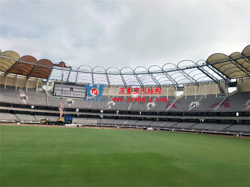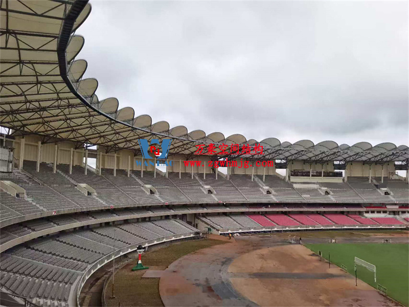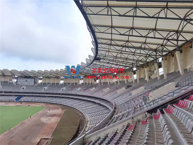 容納3萬(wàn)人肯尼亞內(nèi)羅畢(非洲杯)足球體育場(chǎng),屬于整體性改擴(kuò)建項(xiàng)目,因體育場(chǎng)投入使用30余年,原設(shè)施落后陳舊,改造設(shè)計(jì)要求充分考慮原基礎(chǔ)結(jié)構(gòu)安全。項(xiàng)目前期需要進(jìn)行基礎(chǔ)立柱定位,結(jié)構(gòu)屋面拆除等相關(guān)工作,并通過(guò)科學(xué)有效的技術(shù)措施處理,3D掃描,健康檢測(cè),建模分析等,經(jīng)過(guò)多輪方案比選后,最終選擇PTFE膜屋面大懸挑空間結(jié)構(gòu)。主體桁架懸挑45米,橫向聯(lián)系向上起拱,屋面采用高自潔PTFE膜結(jié)構(gòu),開(kāi)口式體育場(chǎng)內(nèi)部視野空曠無(wú)遮擋,讓非洲人民足球夢(mèng)想在這里展翅高飛。該項(xiàng)目作為2026年非洲杯足球賽體育場(chǎng)之一投入使用,改擴(kuò)建設(shè)計(jì)生產(chǎn)施工全部由萬(wàn)豪團(tuán)隊(duì)完成,充分體現(xiàn)了萬(wàn)豪的設(shè)計(jì)施工服務(wù)能力,也為海外市場(chǎng)的拓展奠定了扎實(shí)的基礎(chǔ)。