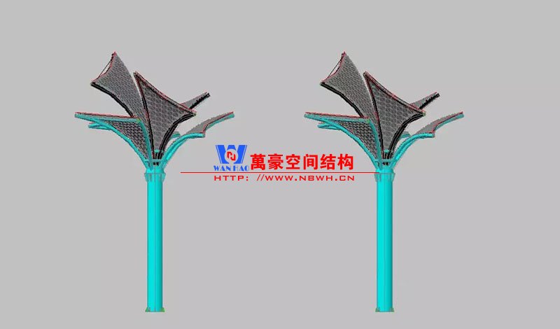 其中主席臺龍舟拉膜項目高度為7.25米,膜結構屋面材質為PTFE膜材。廣場鋼拉膜項目由六個龍船花造形景觀組成,每個龍船花景觀造形立柱的高度不得低于3.80米,花瓣造形最低高度 7.54米,花瓣造形最高高度9.608米,膜結構屋面材質為 PTFE網格基布雙面貼透明ETFE建筑膜。