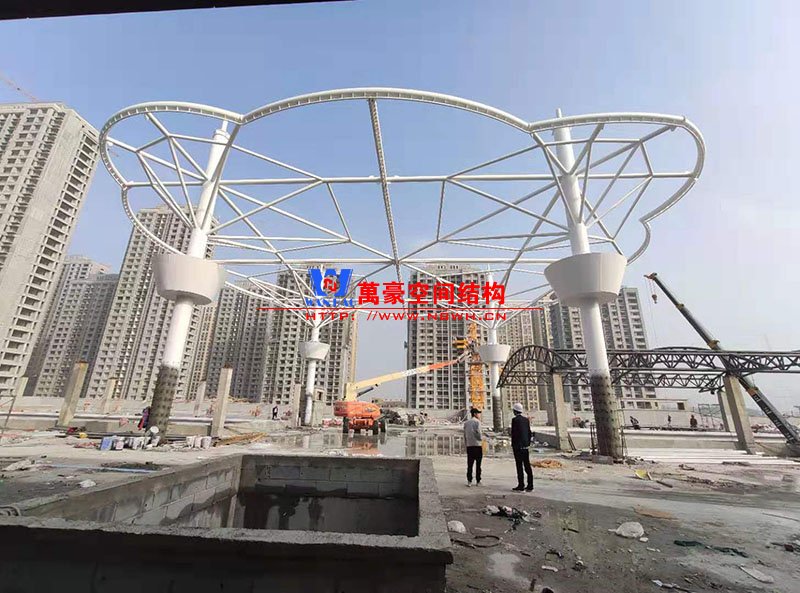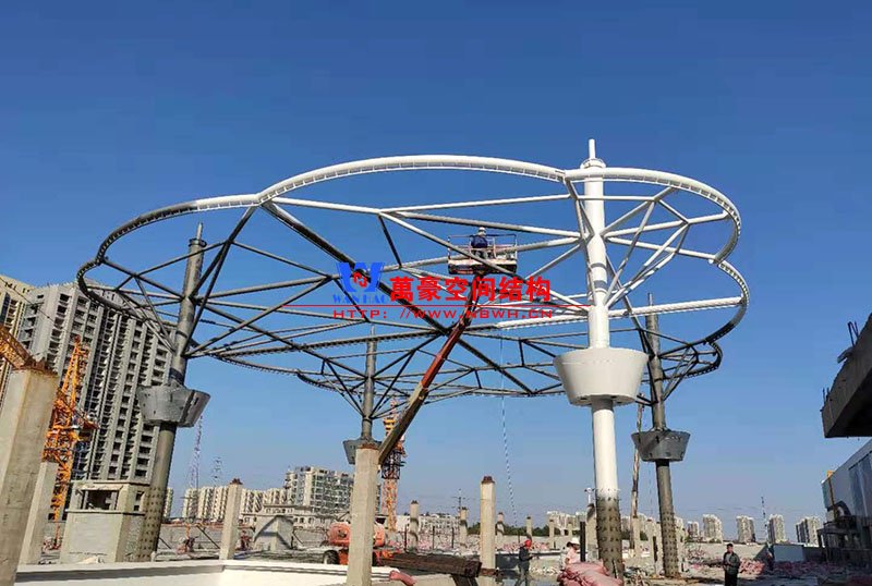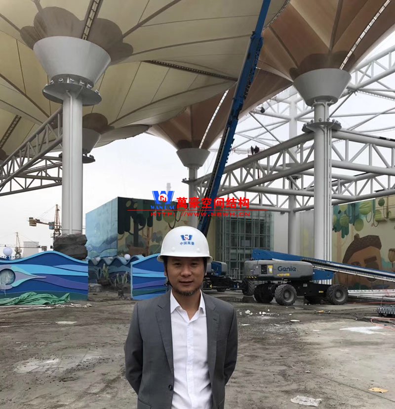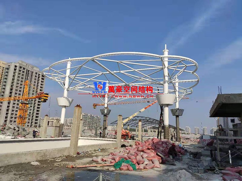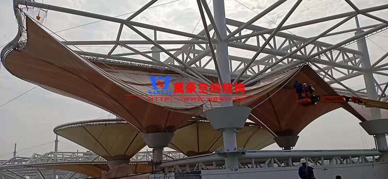 該項目設計思路沿用了上海世博軸的倒傘形狀,其中最大的一個傘形面積達8000平米,工程共計用鋼1500噸,膜結(jié)構(gòu)展開面積3萬平米,是鋼、膜、索結(jié)合真正意義上的大型索膜結(jié)構(gòu)。
