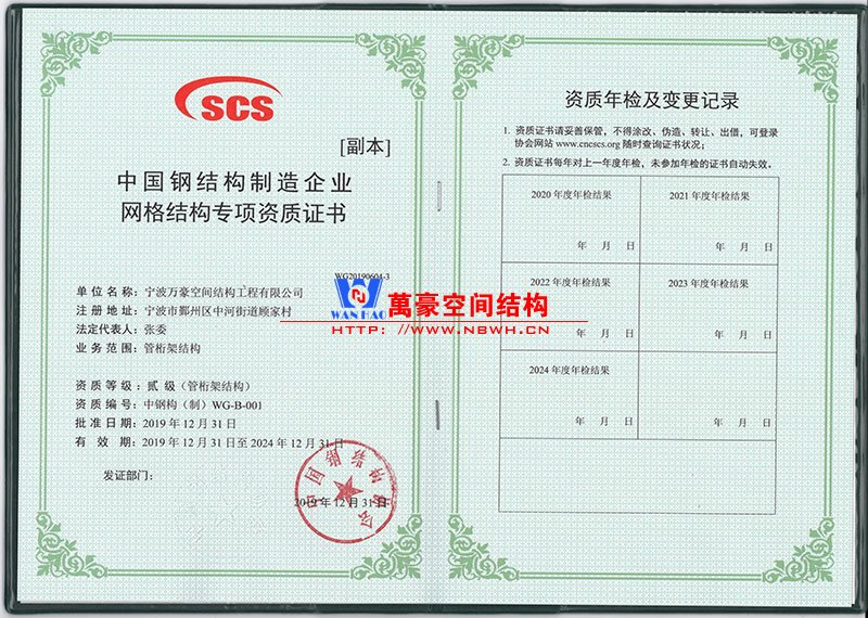 喜訊!喜訊! 萬(wàn)豪膜結(jié)構(gòu)獲得中國(guó)鋼結(jié)構(gòu)制造企業(yè)網(wǎng)格結(jié)構(gòu)專項(xiàng)資質(zhì)證書(shū)。