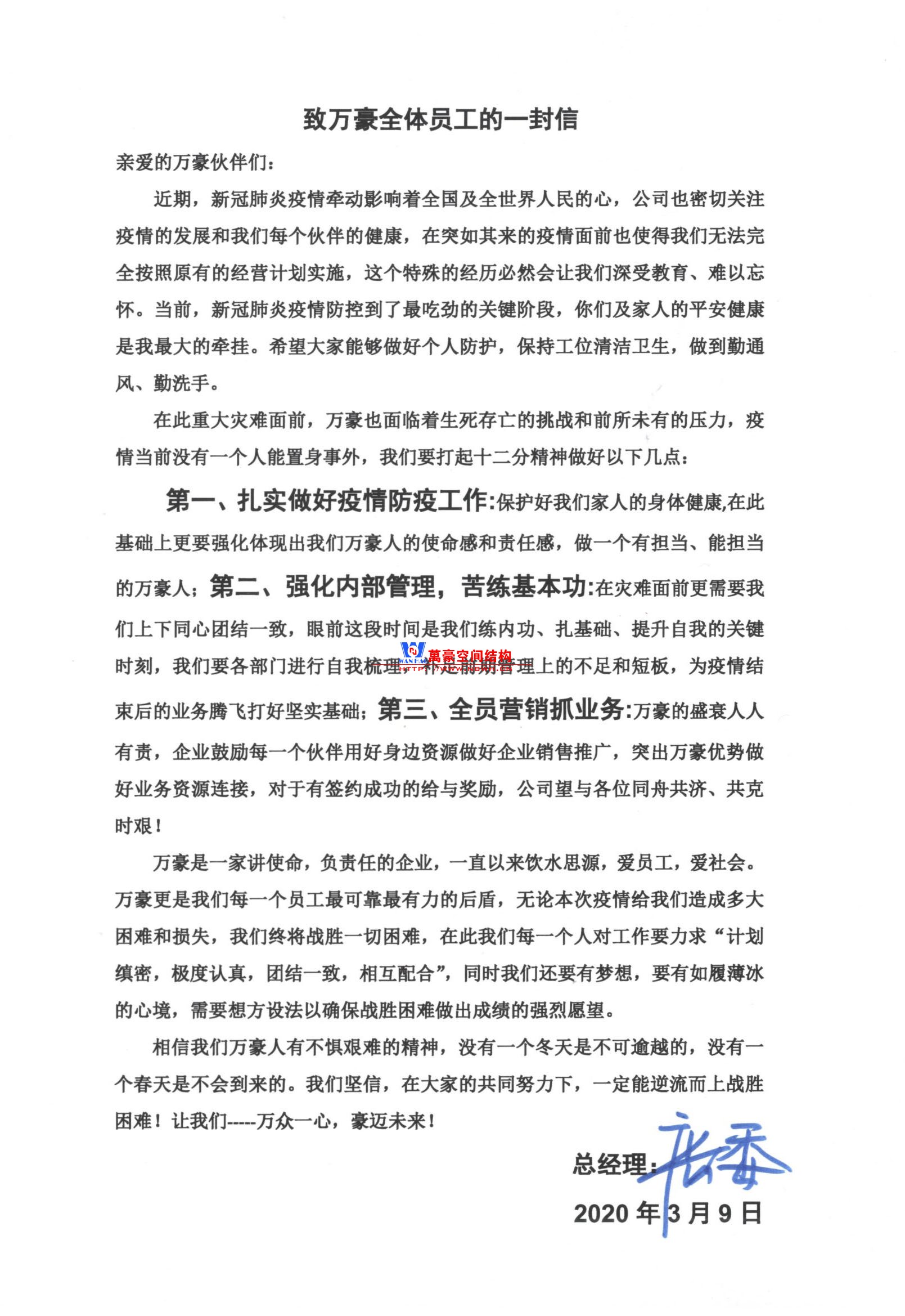 疫情當前感謝大家返崗復工,在此疫情中我們深刻體會到了前所未有的壓力和困難,目前各行各業面臨著破產關門的風險,我們同樣面臨著各方面的挑戰。在此存亡之際挑戰面前更需要我們上下同心,團結一致共同面對目前的困難;萬豪是有使命感和責任感的企業,在此危難時刻更能體現我們每個人的擔當和格局,特此給萬豪全體員工書信一封,望大家能仔細查閱并落到實處,公司倡導全員營銷,非市場部門員工如相互有業務連接、推薦、介紹給公司,統一報備總經辦蔡總處登記備案,簽約成功公司將給與獎勵。