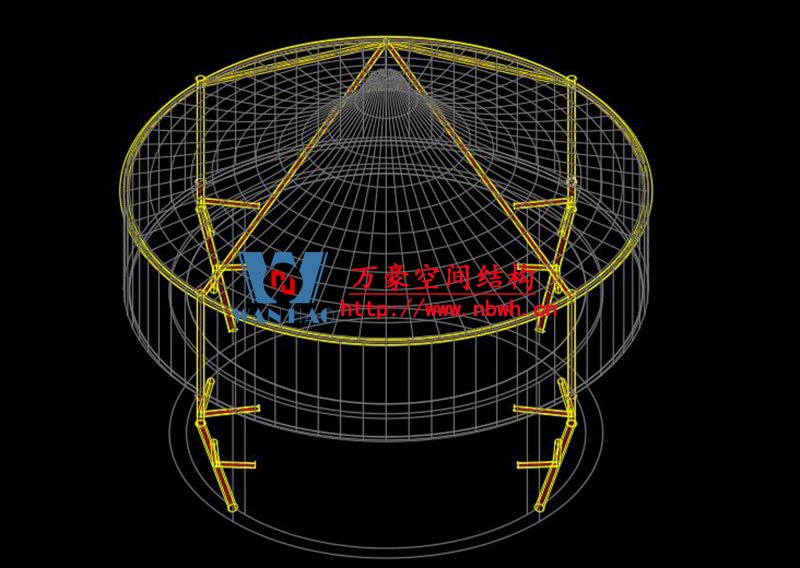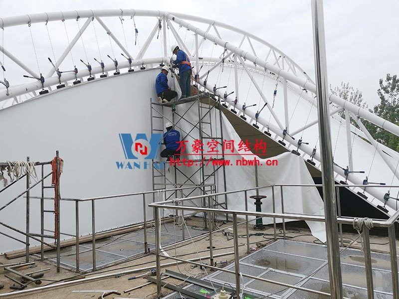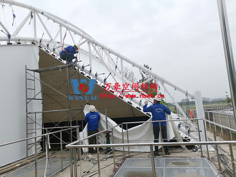 淮安鹽化新材料產業園區污水處理廠膜結構項目位于江蘇省淮安市,由寧波萬豪空間結構工程有限公司承建。該項目采用碳鋼骨架(外側)+聚酯纖維(反吊)結構形式,造型美觀,經濟適用。