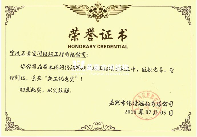 我司承建的浙江麗水內(nèi)河停船塢膜結(jié)構(gòu)工程項(xiàng)目獲得業(yè)主頒發(fā)“施工優(yōu)秀獎”。