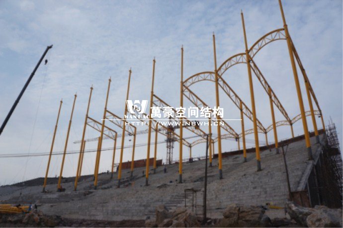 橫店影視城被一圈連綿起伏的山巒包圍著,層疊的遠山宛如水墨畫。圓明新園則位于小鎮西邊的山巒中,芳草萋萋、溪水潺潺!花仙湖膜結構看臺坐落于圓明新園春苑東北角,為骨架支撐式膜結構,建筑面積約為16000㎡,看臺主體結構可分為15個單元,屋面膜結構則由30片膜組成。主體結構劃分為四大部分:鋼柱、主桁架、次桁架和馬道。鋼柱高34.76米,單個重量達8.2噸;主桁架長70.66米,柱間距15米,看臺屋面猶如浮動的金色流云,徜徉在花仙湖上空。此項目為全國最大的“水戲”表演建筑的看臺,同時也是水上樂園彩色膜結構最大的一個景觀。