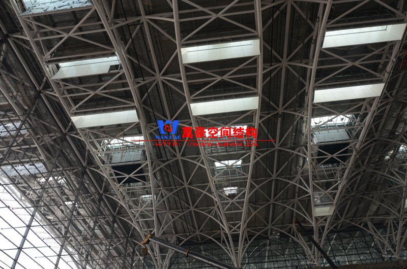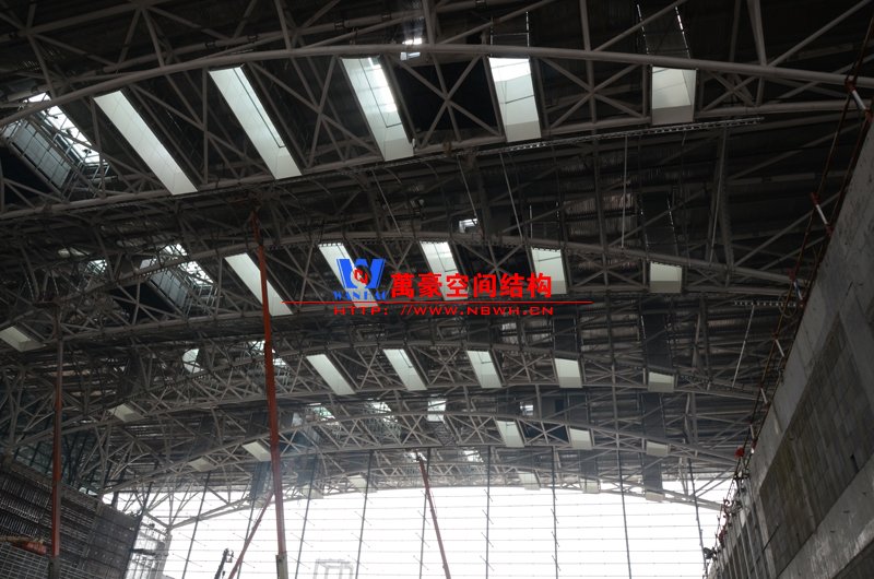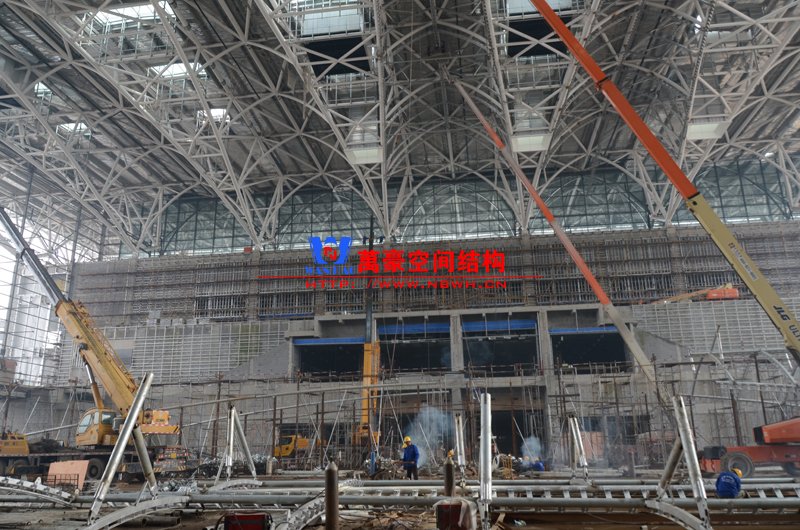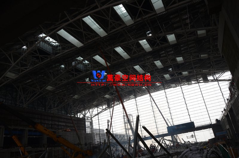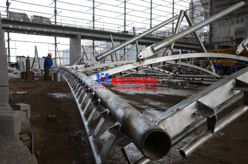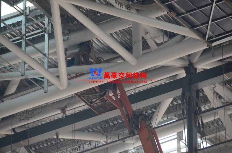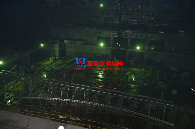該膜結(jié)構(gòu)由內(nèi)外兩部分膜組成,所有鋼構(gòu)件及膜材均采用吊頂反裝式,主體結(jié)構(gòu)高度達40米。施工現(xiàn)場吊裝難度非常大,因采用PTFE材質(zhì)內(nèi)外膜,對整體鋼結(jié)構(gòu)精度要求非常高。我們現(xiàn)場鋼結(jié)構(gòu)施工過程中均委派專業(yè)計量人員及質(zhì)檢人員全程參與數(shù)據(jù)實時復核以提高精確度。因本項目作為青島市標桿項目,工期急,工藝要求高,我司作業(yè)人員基本采用24小時輪班工作制,節(jié)假日全部無休,只為早一天將此項目順利竣工交付給業(yè)主單位。
