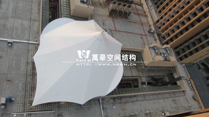 本工程總建筑面積約900平方米,主體一根主柱、九根支柱,四周單片桁架連接,總體一個帽柱,直線長為26.9米,帽柱總高33.6米,寬為27.8米。因為本工程坐落在商業區中心,四周都是五層商鋪,吊車無法進入施工現場,先用25噸吊車把材料送到五層樓房頂,后用人工或手拉葫蘆進行運送和安裝。施工范圍包括鋼結構系統與膜材系統的制作和現場安裝施工,現工程已經完工。